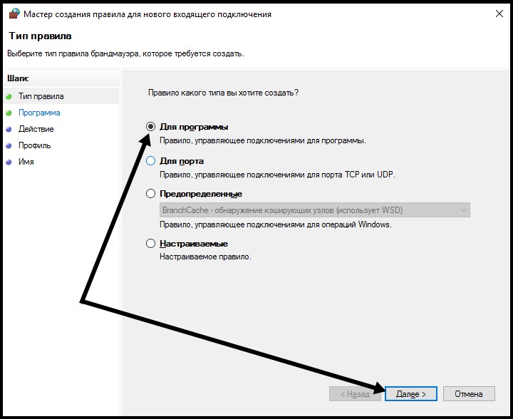| В появившемся окне выбора типа правила, выберите, пожалуйста, пункт "Для программы" и нажмите кнопку "Далее>" |