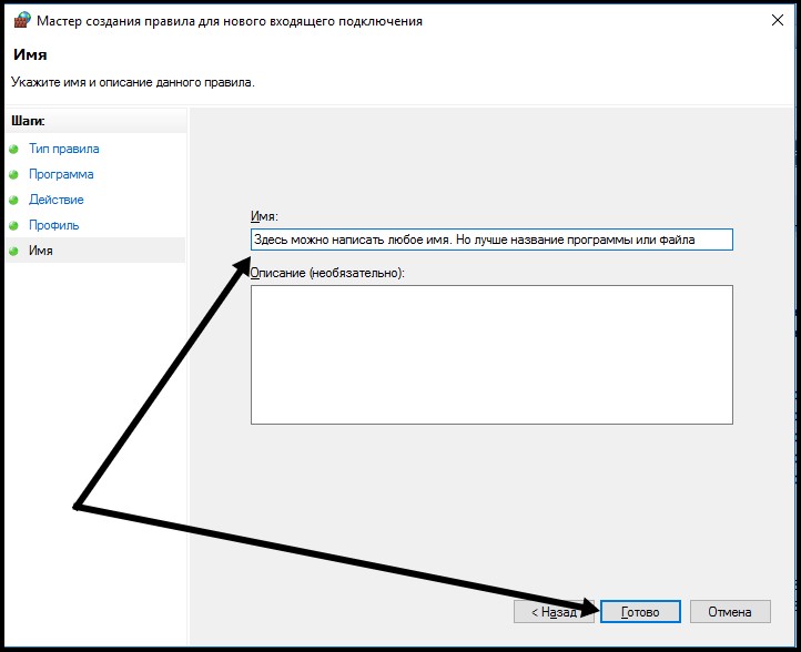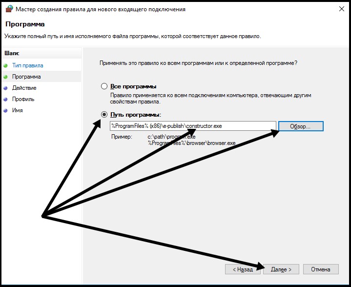 В следующем окне, окне указания имени правила, укажите, пожалуйста, имя правила. Имя правила может быть произвольным, но во избежание возможной путаницы рекомендуем ввести, как название правила, название файла - constructor.exe, или название программы - Конструктор сайтов E-Publish
