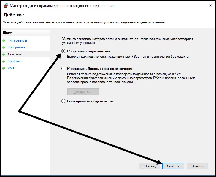 | В следующем окне убедитесь, что отметка стоит на пункте "Разрешить подключение" и нажмите кнопку "Далее>" |
