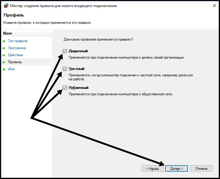 | В следующем окне, окне выбора профиля, убедитесь, что отметки стоят на всех пунктах и нажмите кнопку "Далее>" |