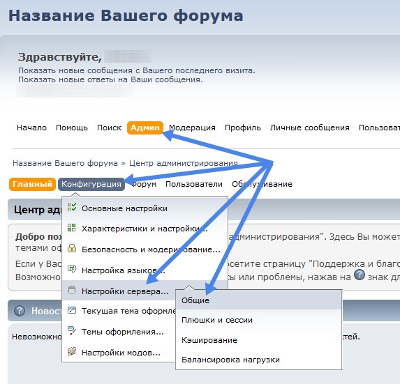 Пройти по этому пути можно, нажав кнопки: Админ -> Конфигурация -> Настройки сервера -> Общие.