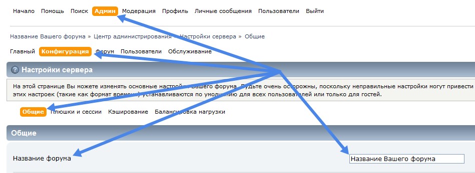 Для смены названия Вашего форума, пройдите, пожалуйста, в меню форума: Центр администрирования -> Настройки сервера -> Общие.