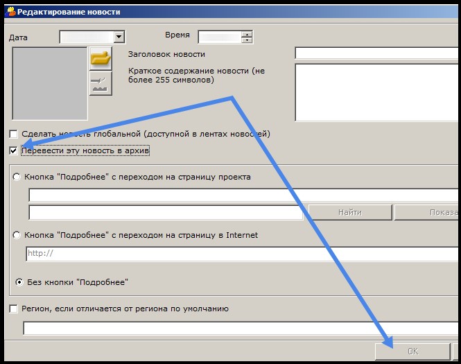 При добавлении/изменении новости установите отметку на пункте "Перевести эту новость в архив", тогда новость будет отображаться на типовой странице "Архив новостей". | |
