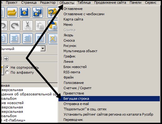 Для того, чтоб внести изменения в тексте бегущей строки, выделите, пожалуйста, кликом левой кнопки мыши, данный объект и перейдите в меню Конструктора: Объекты - Бегущая строка.
