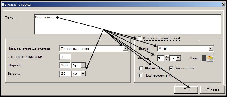 Внеся изменения в текст бегущей строки, подтвердите изменения, нажав кнопку "ОК".