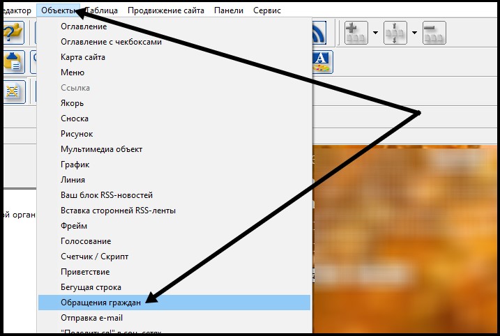 Для того, чтоб установить модуль "Обращения граждан" на сайте, установите, пожалуйста, курсор в место на странице, где Вы желаете разместить модуль, и перейдите в меню Конструктора: Объекты - Обращение граждан. |