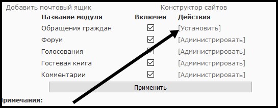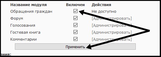 Перейдя на страницу управления дополнительными модулями, установите, пожалуйста, отметку напротив пункта обращений граждан и нажмите кнопку "Применить" | |