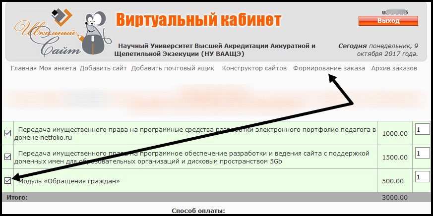 отдельной квитанцией или формированием заказа в виртуальном кабинете.