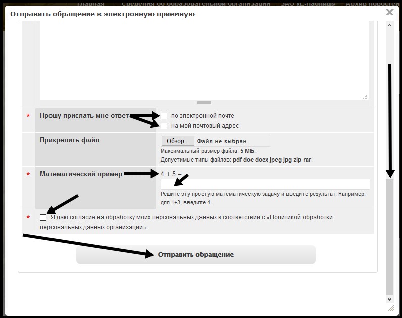 После написания текста сообщения, прокрутив скролл вниз, укажите, пожалуйста, в какой форме Вы желаете получить ответ (на электронную почту, или на физический адрес);