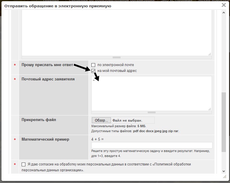Если Вы выберите вариант с отправкой ответа на физический адрес, ниже появится окно для ввода адреса. | |