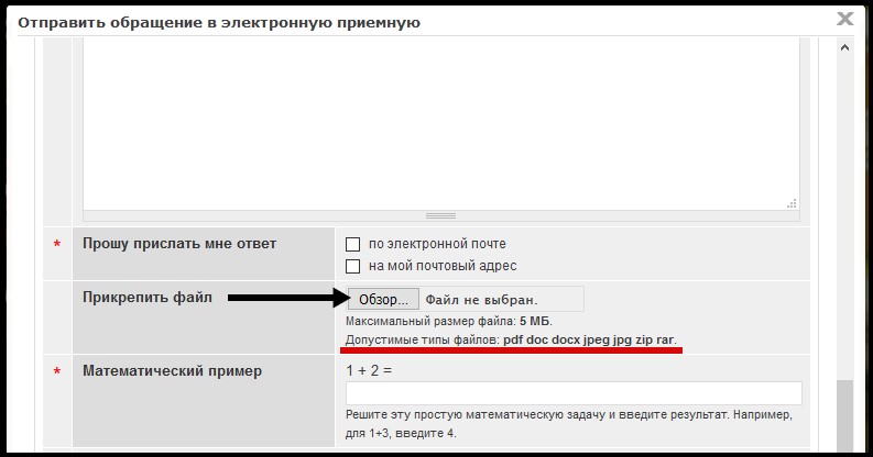 | Также к форме можно прикрепить файл следующих форматов: pdf, doc, docx, jpeg, jpg, zip, rar. |