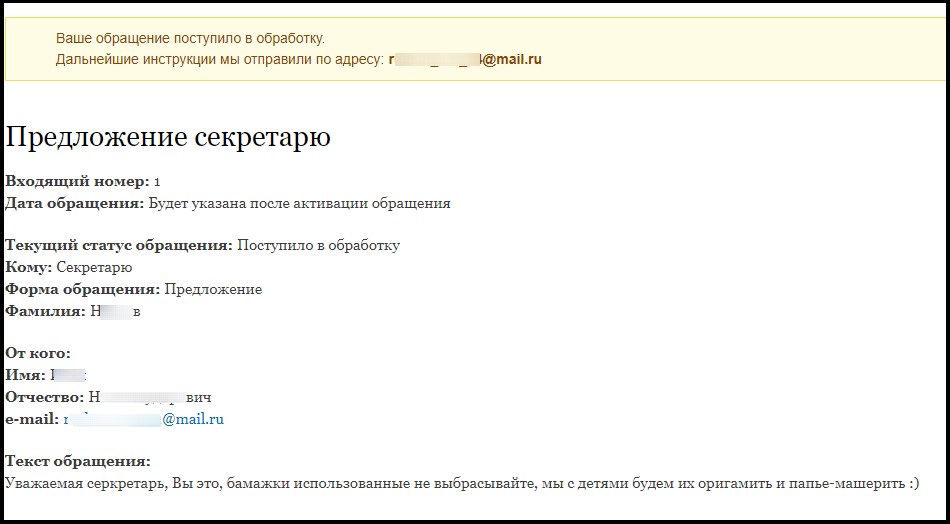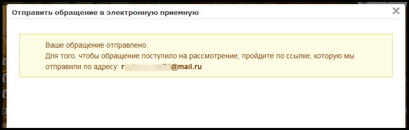 После нажатия кнопки "Отправить обращение" Вы увидите сообщение о том, что Вам на почту отправлено автоматическое уведомление со ссылкой на подтверждение отправки. |