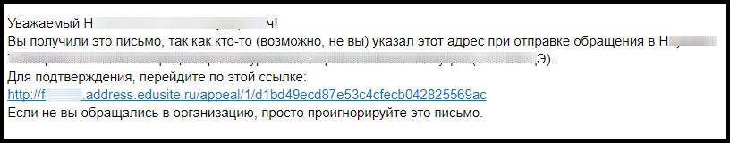 После нажатия кнопки "Отправить обращение" Вы увидите сообщение о том, что Вам на почту отправлено автоматическое уведомление со ссылкой на подтверждение отправки. | |