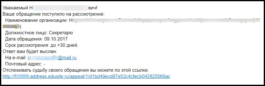 Также в уведомлении будет указана ссылка, пройдя по которой вы сможете отслеживать состояние Вашего обращения. |