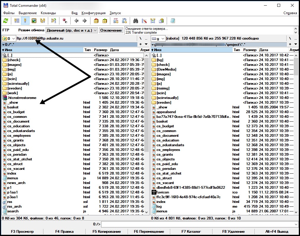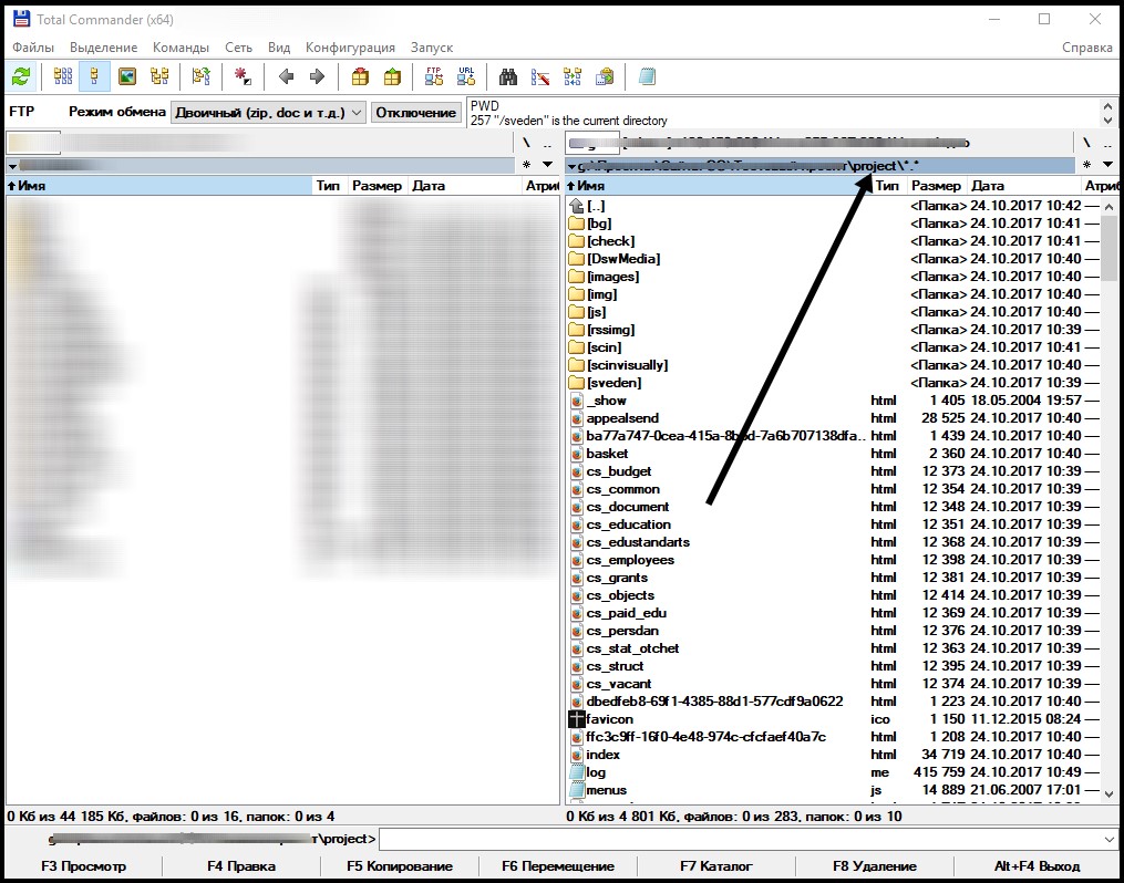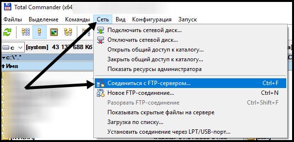 В левой части Total Commander’а необходимо установить соединение с FTP-сервером.