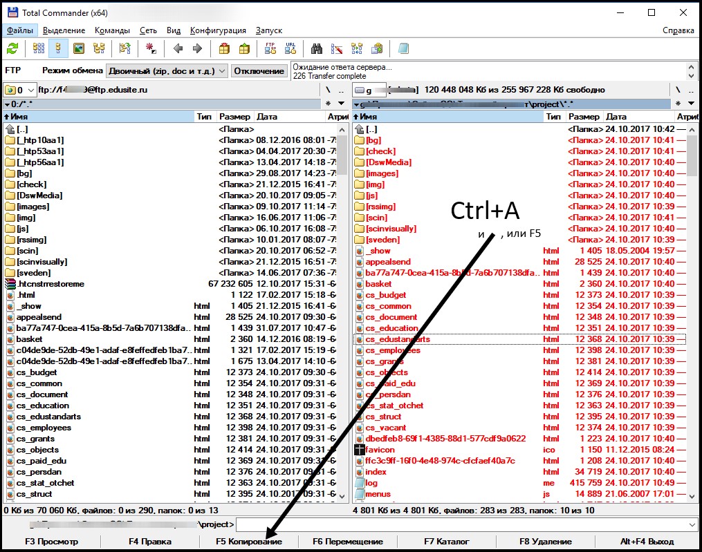 Для этого выделите, пожалуйста, правое поле Total Commander’а (поле, где у Вас открыта папка project Вашего проекта) и, выделив всё (сочетанием клавиш Ctrl+A), нажмите кнопку "F5 Копирование" (внизу окна Total Commander’а), или просто нажмите клавишу F5 на клавиатуре. |