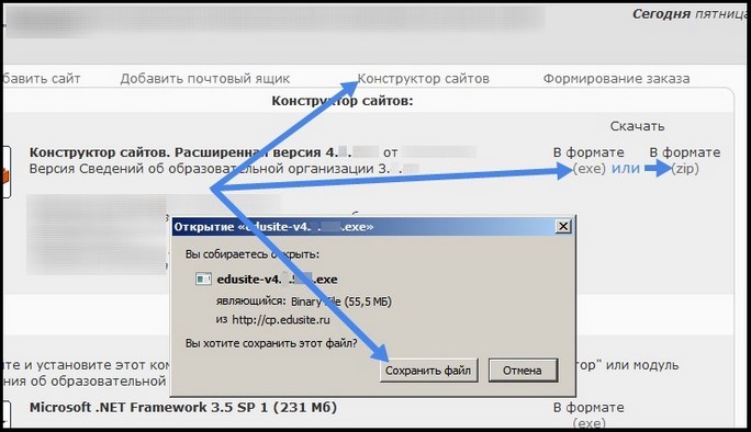 Для того, чтобы скачать установочный файл (или архив с установочным файлом) Конструктора, пройдите, пожалуйста, в Ваш виртуальный кабинет, перейдите во вкладку "Конструктор сайтов" и нажмите кнопку "(exe)", если желаете скачать напрямую установочный файл, или на кнопку "(zip)", если желаете скачать архив с установочным файлом. |