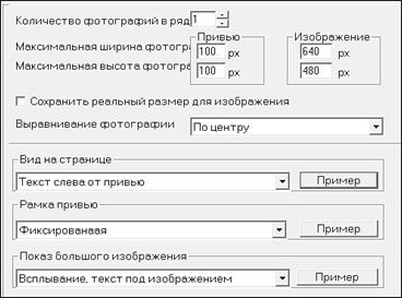 «Максимальная ширина фотографии»: для привью и для полной фотографии. Обычно на цифровых фотоаппаратах выставлены значения для печати, которые слишком велики для экранного просмотра. Конструктор сам приведет значения к выставленным вами.