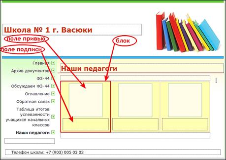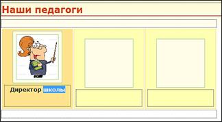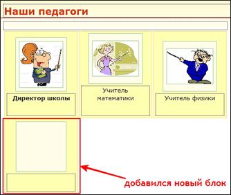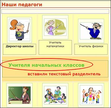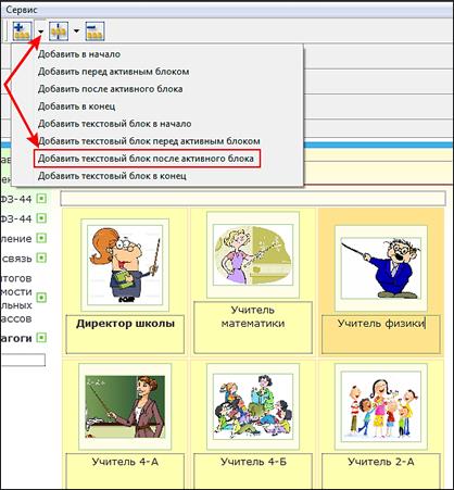 Между группами блоков можно вставлять разделители. Например, вставим текстовый разделитель перед группой учителей начальных классов. Для этого выделим блок («Учитель физики») и выберем «Вставить тестовый блок после активного блока» | |