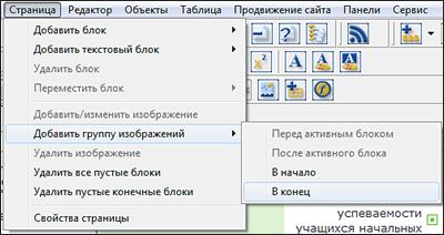 2. В меню «Страница» выберите «Добавить группу изображений» и укажите куда добавить (в конец, в начало, до или после активного блока) | |