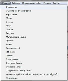 | Оглавление сайта – это список имен всех страниц сайта с соответствующими ссылками на эти страницы. Вставить оглавление можно в любом месте сайта, к примеру на странице «Оглавление». Зайдем на страницу «Оглавление» и выберем из меню «Объекты» пункт «Оглавление» |