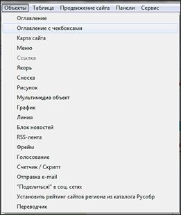 Оглавление сайта – это список имен всех страниц сайта с соответствующими ссылками на эти страницы. Вставить оглавление можно в любом месте сайта, к примеру на странице «Оглавление». Зайдем на страницу «Оглавление» и выберем из меню «Объекты» пункт «Оглавление» | |
