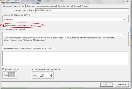 В окне «Свойства проекта» отметьте «Возможность поиска по сайту» | |