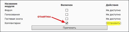| Чтобы модуль «Комментарий» заработал на вашем сайте, его надо активировать на сервере. Сделать это можно в вашем Виртуальном кабинете следующим образом. |