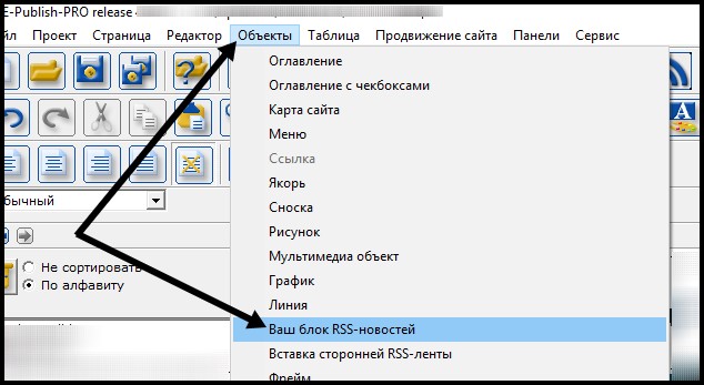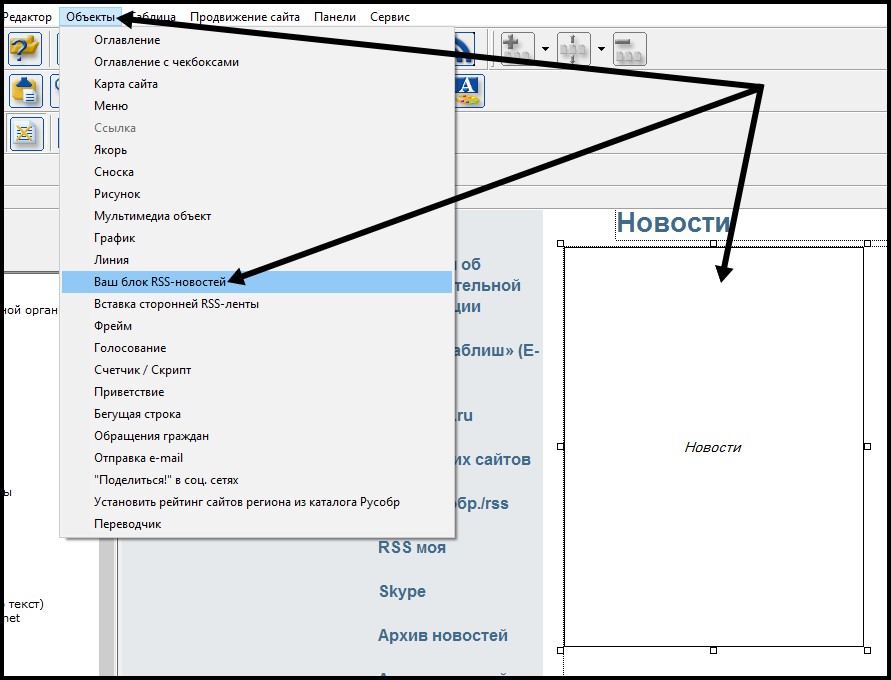 Для размещения RSS-ленты на странице, установите, пожалуйста, курсор в месте, в котором Вы желаете разместить RSS-ленту и перейдите в меню Конструктора: Объекты – Ваш блок RSS-новостей. |