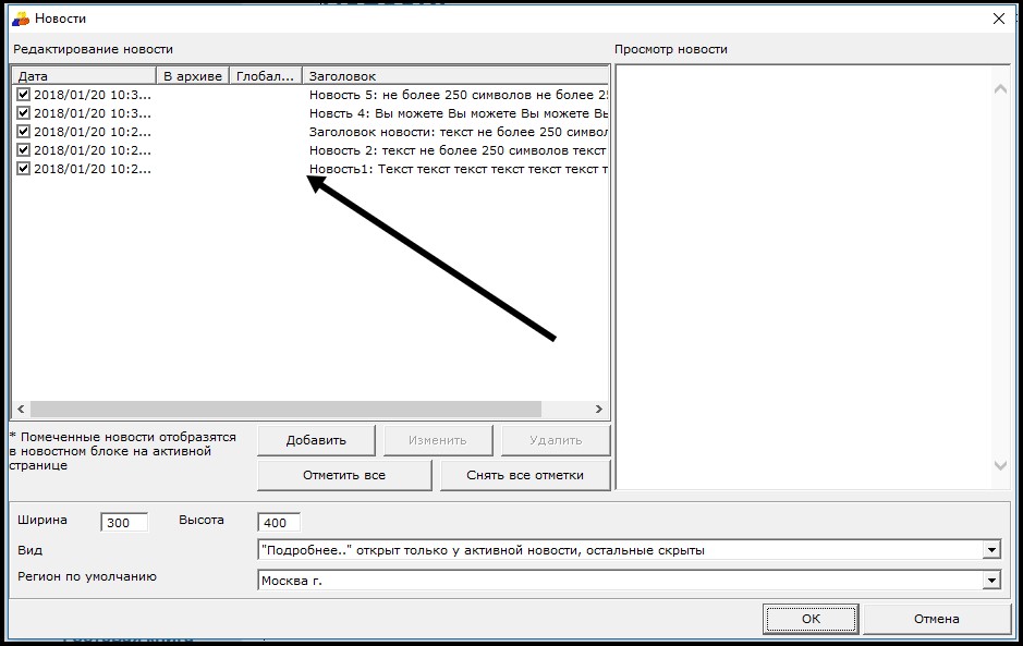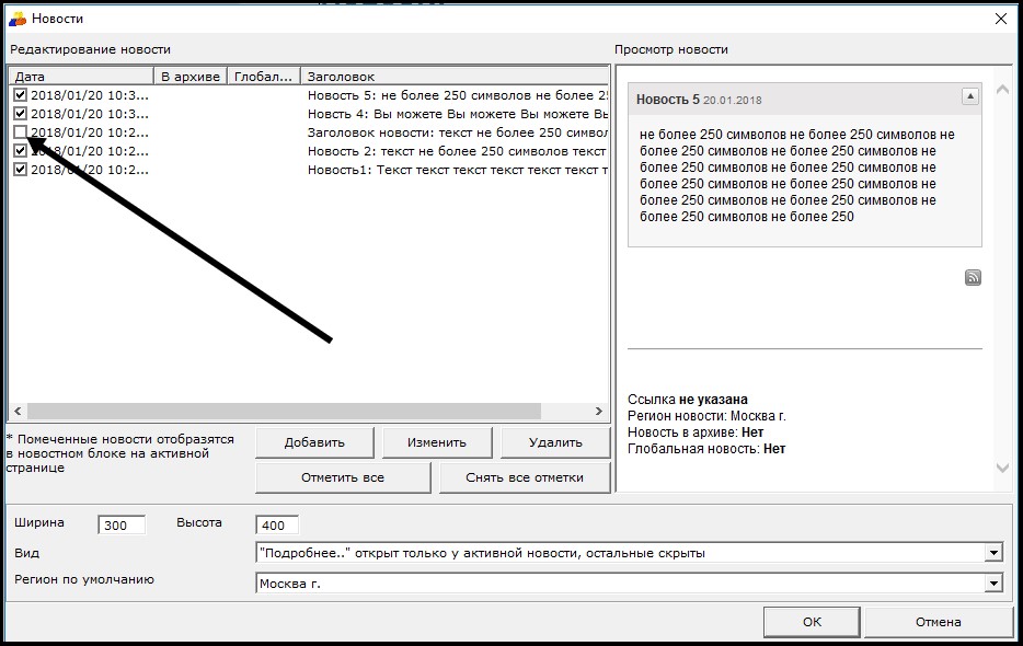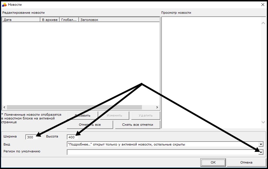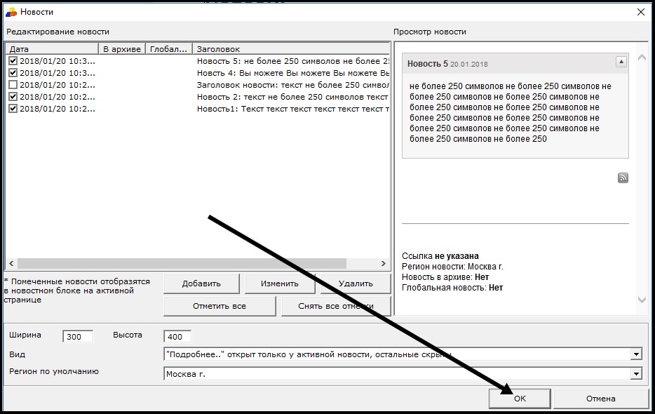 В окне редактирования Вы можете указать размер окна блока новостей (размер всегда можно будет изменить при редактировании). | |