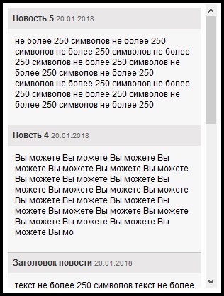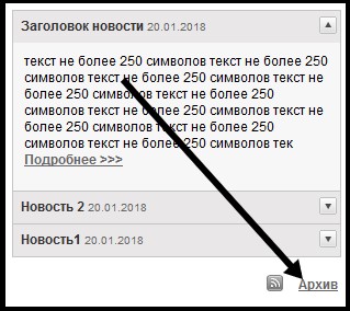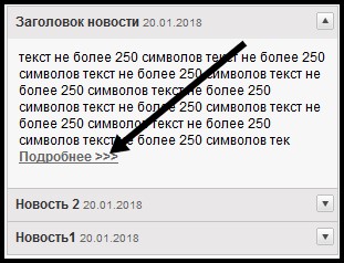 При выборе варианта "Подробнее.." открыт только у активной новости, остальные скрыты" раскрытой в блоке будет только последняя новость, остальные будут свернуты. Развернуть их можно будет просто кликом по новости. | |