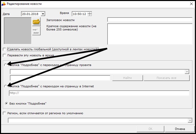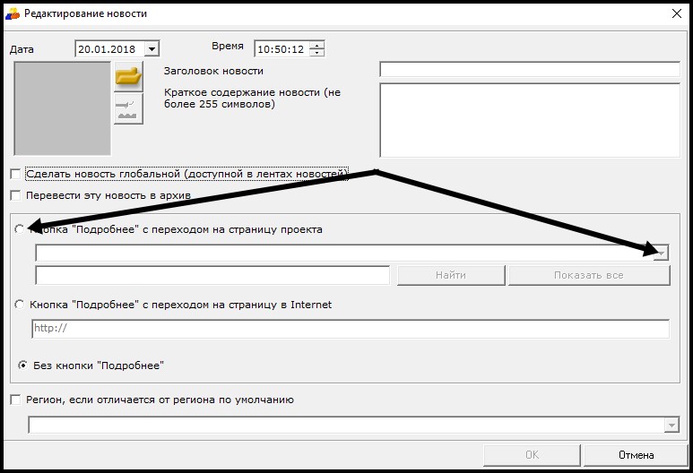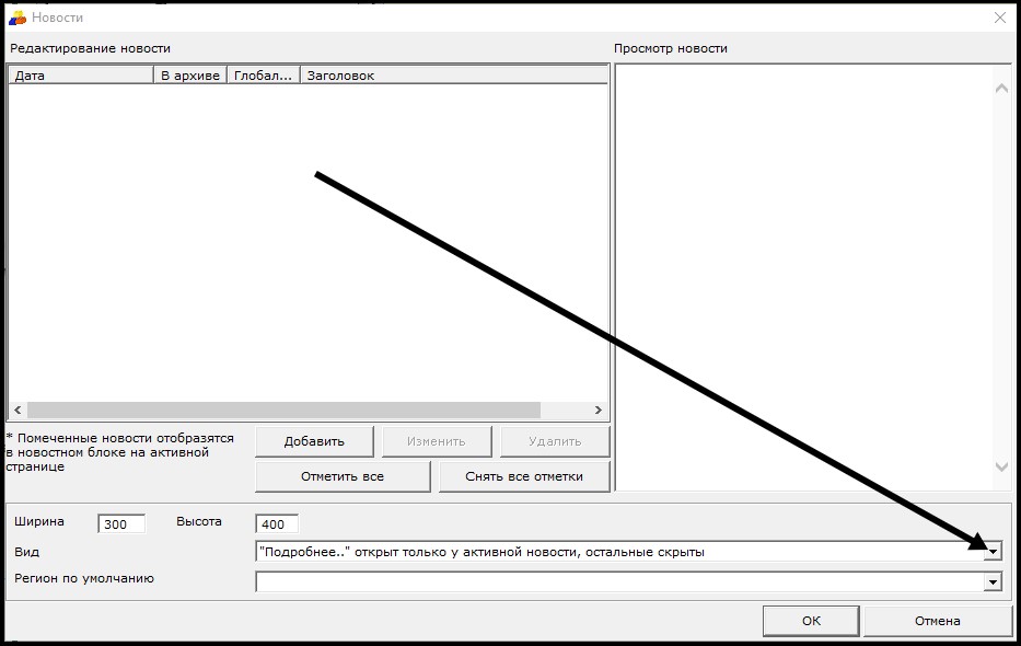 Появится окно добавления/редактирования новости, в котором необходимо выбрать регион.
