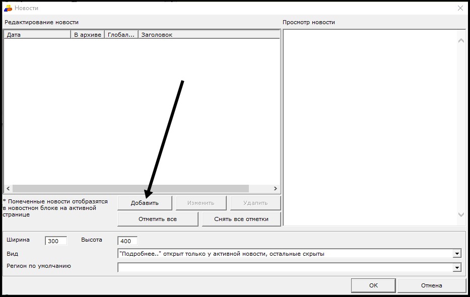 Для добавления новости в блок необходимо нажать кнопку "Добавить". | |