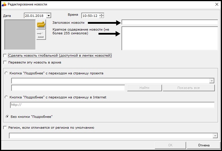 Установив отметку на пункте "Подробнее", Вы разместите в новости ссылку для перехода на более подробное описание новости. | |