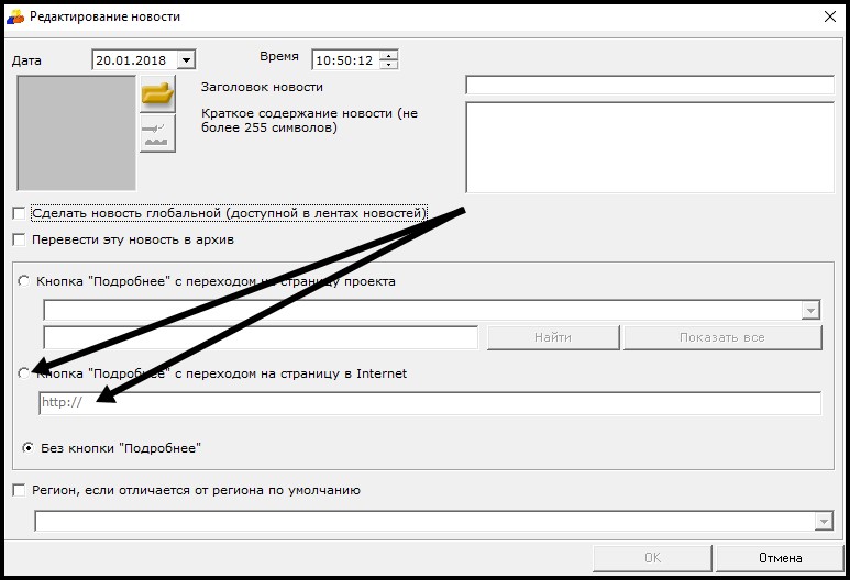 | Если новость сообщает о каком-либо мероприятии, описанном на стороннем ресурсе, к примеру, в новости говорится о региональной олимпиаде, то установите, пожалуйста, отметку на пункте "Кнопка "Подробнее" с переходом на страницу в Internet" и укажите адрес страницы, на которую будет осуществляться переход. |
