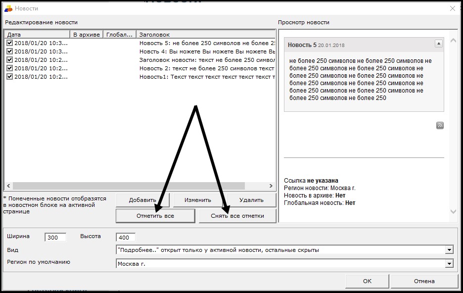 Также Вы можете установить отметки, или снять, со всех новостей сразу. | |