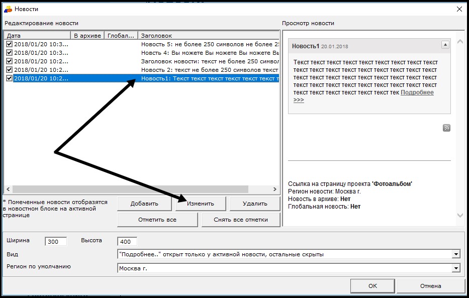 В окне редактирования Вы можете указать размер окна блока новостей (размер всегда можно будет изменить при редактировании). |