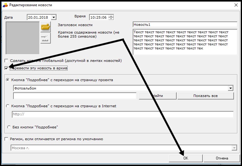 Перейдя в редактирование новости, установите, пожалуйста, отметку на пункте "Перевести эту новость в архив" и подтвердите внесенные изменения. | |