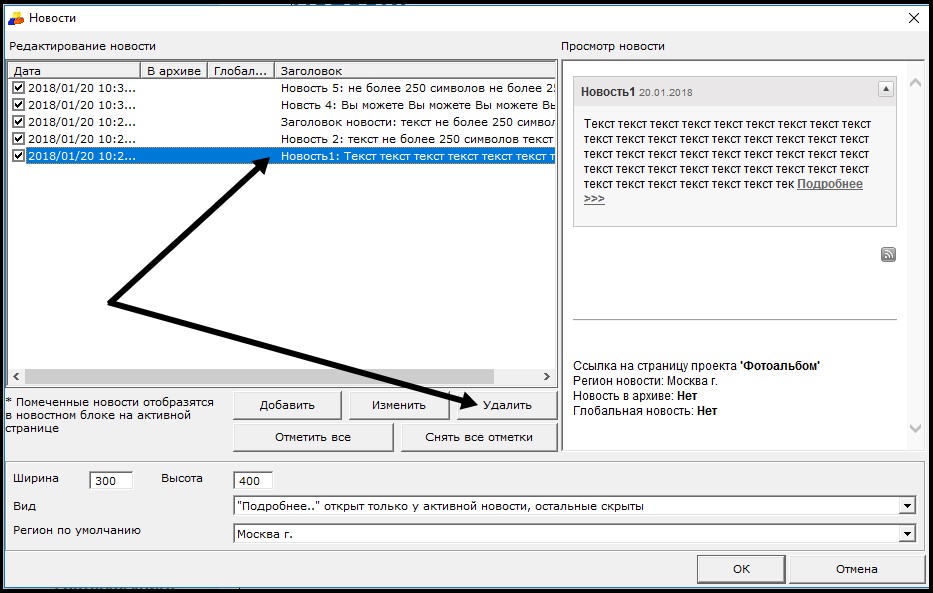 При необходимости полностью удалить новость из объекта, выделите, пожалуйста, новость и нажмите кнопку "Удалить". |