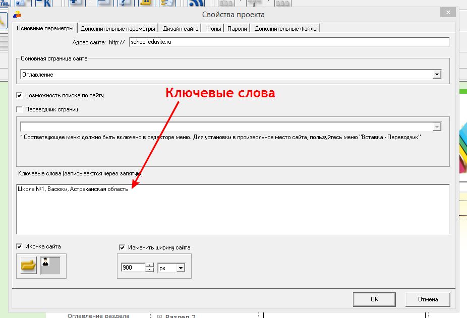 Для того, чтобы ваш сайт можно было легко найти посетителям, необходимо для всего сайта и для каждой страницы написать ключевые слова и словосочетания.