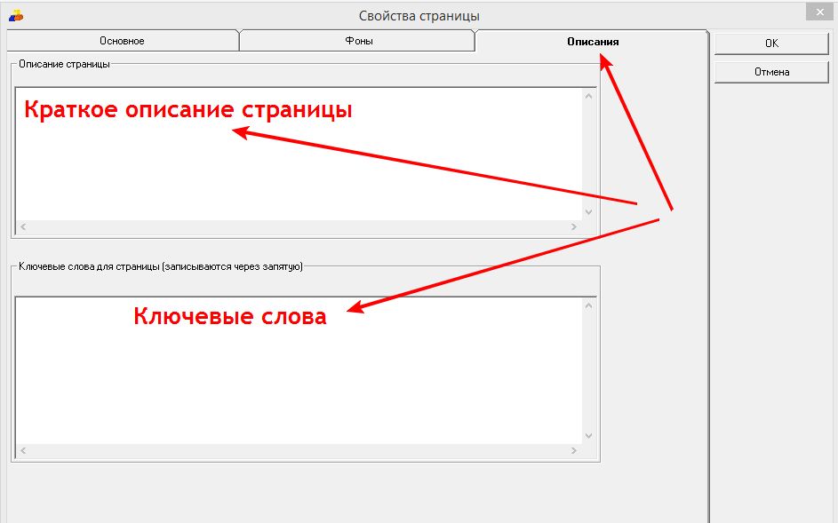 Перейдите на вкладку "Описание", введите ключевые слова, характерные для выбранной страницы и краткое описание | |