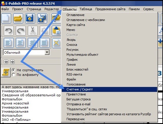 Если же Вы желаете чтоб при клике на баннер происходили какие-то действия внутри него, то это можно сделать, присоединив код (скрипт) готового баннера. Для того, чтоб разместить полученный html-код, установите, пожалуйста, курсор в место, в котором Вы желаете разместить баннер, и пройдите в меню Конструктора: Объекты - Счетчик/Скрипт. |