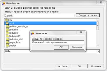 | Создайте отдельную папку для вашего проекта (вы можете вести несколько сайтов, и каждый из них должен располагаться в отдельной папке). Для этого щелкните кнопку «Создать папку». Дайте папке понятное вам имя, например «Основной сайт организации». Завершите создание проекта щелчком по кнопке ОК. Наш проект создан, хотя пока не наполнен |